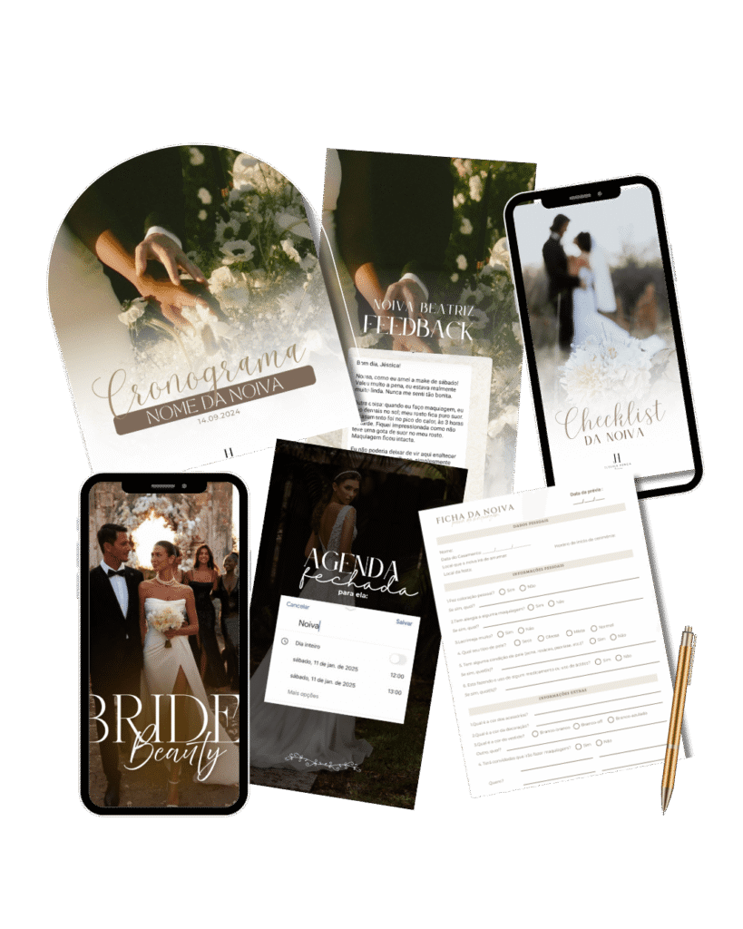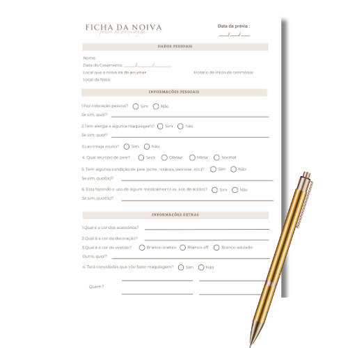 Tenha o passo a passo completo da ficha da noiva, com todas as perguntas necessárias para que a prévia seja perfeita. E de BÔNUS deixei uma lista completa para você não esquecer nada no dia, na hora de organizar a sua mala para atendimento externo.